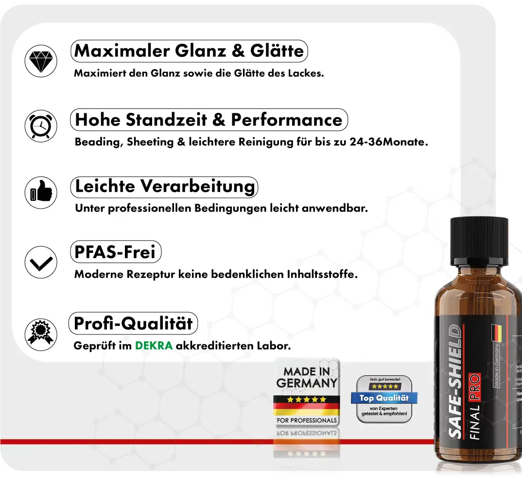 Our Final Pro ceramic sealant is developed, manufactured, and tested in Germany. The sealant complies with all current regulations & at the same time offersmaximum performance without compromise.