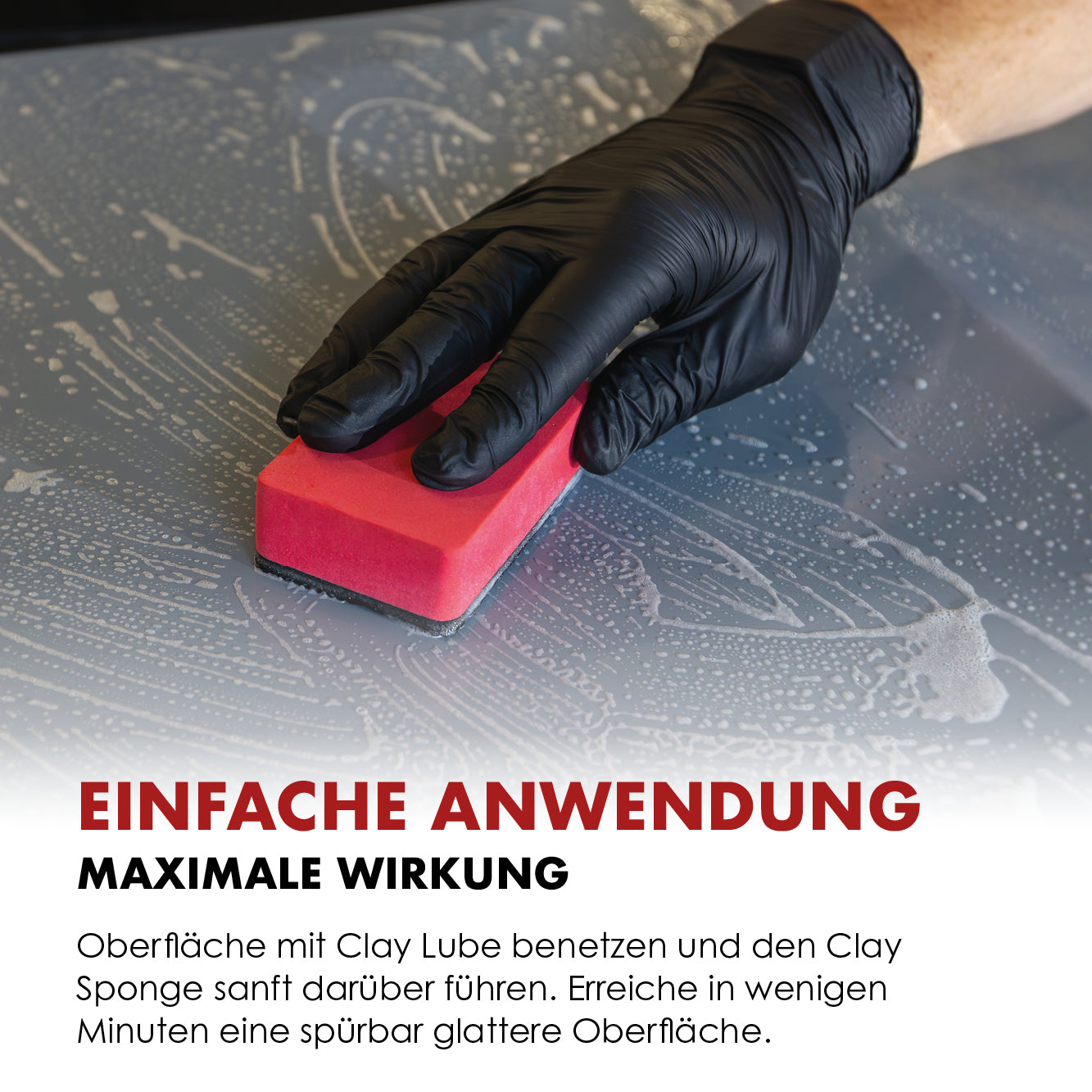 Einfach die Oberfläche mit Clay Lube oder Wasser benetzen und den Clay Sponge ohne Druck über Lack, Glas oder Kunststoff führen. So entfernst du mühelos selbst hartnäckige Rückstände – in wenigen Minuten und ganz ohne Kraftaufwand.
